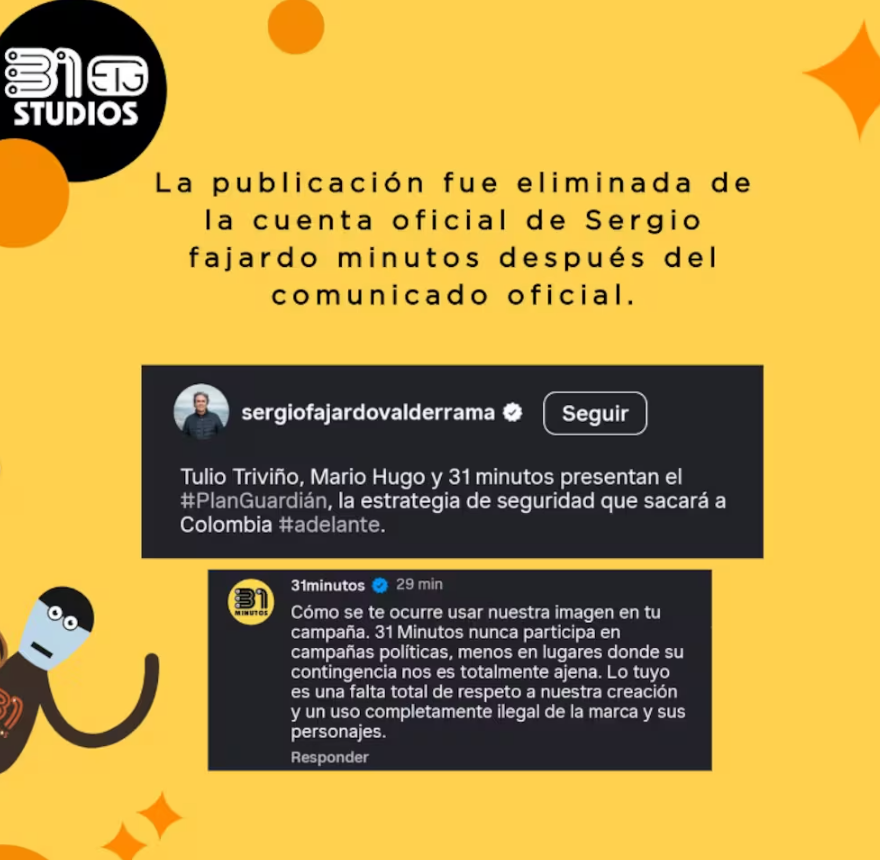 El equipo creativo de 31 Minutos alertó sobre la circulación en redes sociales de una pieza publicitaria de la campaña del candidato Sergio Fajardo, usando personajes y referencias del programa sin autorización.