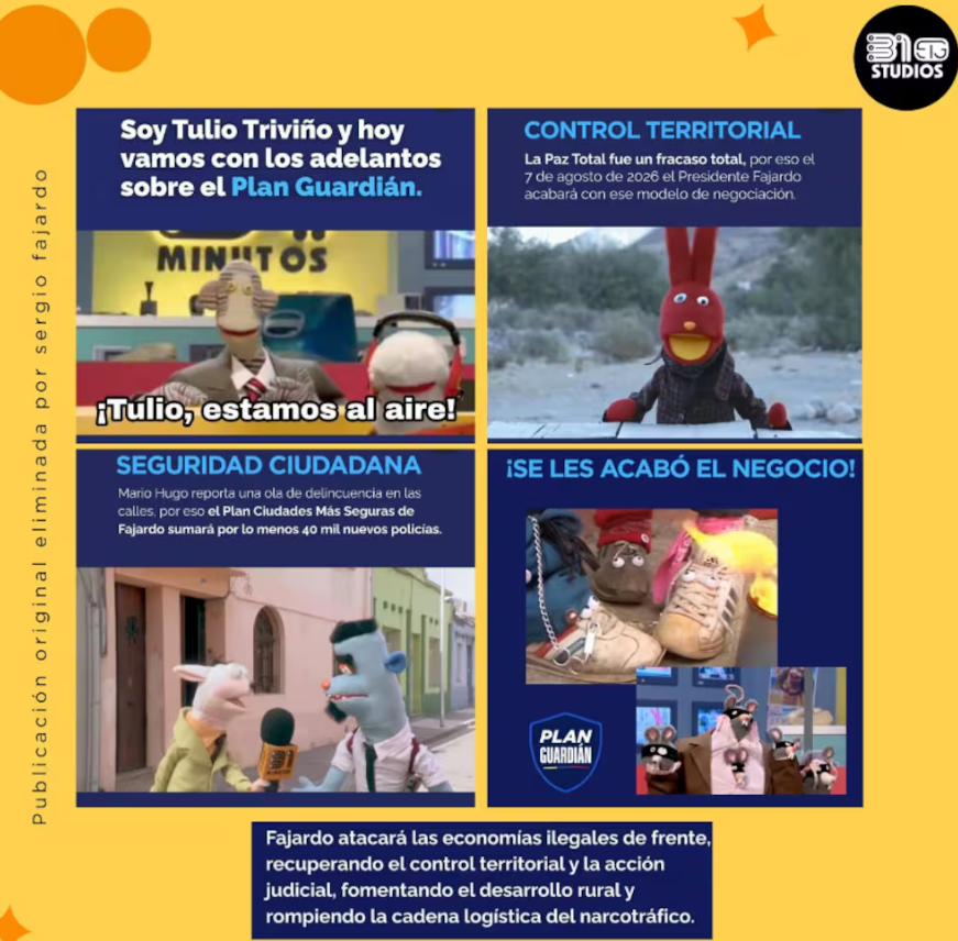 El exalcalde de Medellín y candidato presidencial, publicó una serie de gráficas en redes sociales donde los personajes de la serie chilena presentan sus propuestas. “Tulio Triviño. Mario Hugo y 31 Minutos presentan el Plan Guardián, la estrategia de seguridad que sacará a Colombia adelante”, escribió el candidato.