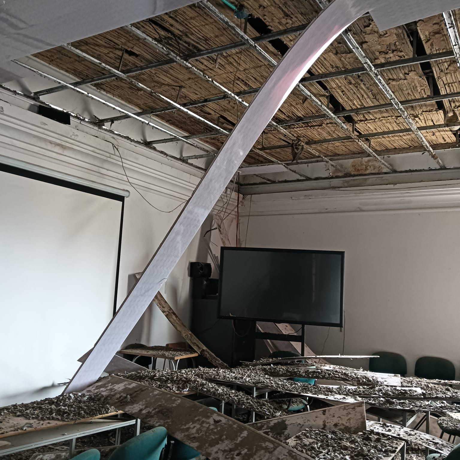 En las recientes visitas de la Unidad de Gestión del Riesgo evidenció la gravedad de la situación, lo que llevó al cierre de espacios cómo el aula múltiple y el aula virtual, las cuales hoy las adorna una cinta que prohíbe su ingreso. A esto se suma, cómo si faltara más, la proliferación de ratones y palomas dada la antigüedad y el deterioro del lugar.
