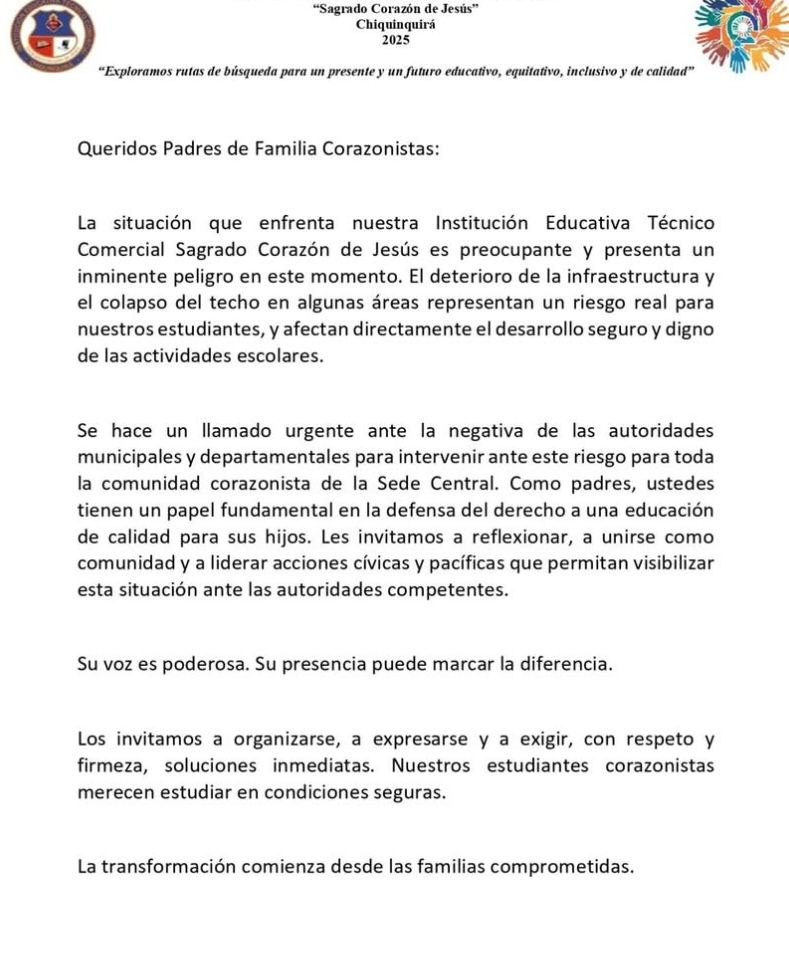 Sin embargo, docentes, padres de familia y estudiantes se niegan a resignarse, y han comenzado a organizarse para protestar y manifestarse por una educación digna y en condiciones adecuadas, antes de que los pocos espacios que quedan terminen por derrumbar la historia o causando una tragedia para Boyacá.