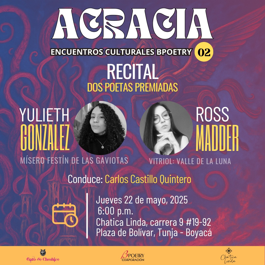 En esta ocasión, se llevará a cabo el RECITAL: DOS POETAS PREMIADAS, con la participación de Yulieth Gonzalez Zea, quien con su libro “Mísero festín de las gaviotas” obtuvo el Premio Internacional de Poesía Joven Martín García Ramos, 2025, del Ayuntamiento de Albox, en España. Y Ross Madder, quien con su libro “Vitriol: valle de la Luna” obtuvo el Premio de Poesía del Consejo Editorial de Autores Boyacenses – CEAB, 2024.