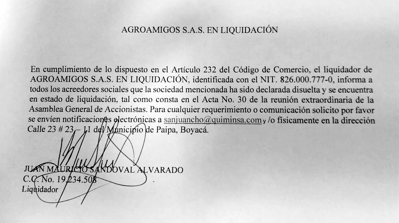 En cumplimiento de lo dispuesto en el Artículo 232 del Código de Comercio, el liquidador de AGROAMIGOS S.A.S. EN LIQUIDACIÓN, identificada con el NIT. 826.000.777-0, informa a todos los acreedores sociales que la sociedad mencionada ha sido declarada disuelta y se encuentra en estado de liquidación, tal como consta en el Acta No. 30 de la reunión extraordinaria de la Asamblea General de Accionistas. Para cualquier requerimiento o comunicación solicito por favor se envíen notificaciones electrónicas a sanjuancho@quiminsa.com y/o físicamente en la dirección Calle 23 # 23 – 11 del Municipio de Paipa, Boyacá.