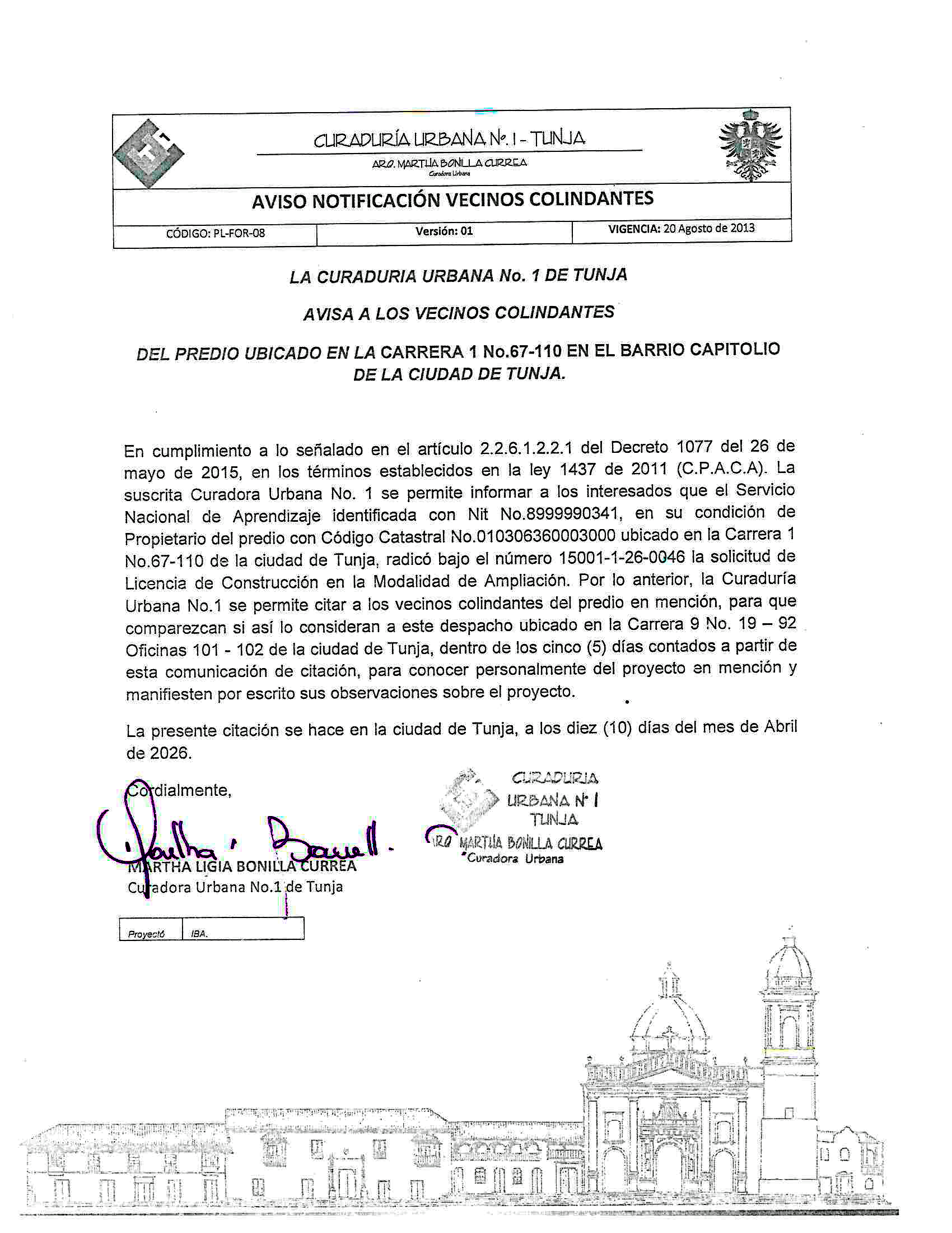 EdictosAviso curaduría urbana Tunja – en el Barrio capitolioPor ELDIARIO Boyacá - abril 14, 2026CuotaFacebookXPinterestWhatsApp Publicidad