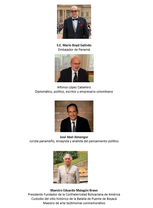 Presidente Sociedad Bolivariana de Cartagena, Sarita Abello fundadora Sociedad Patriótica Bolivariana de Santa Marta y directora de la Quinta de San Pedro Alejandrino, Rafael Iván Toro presidente Sociedad Bolivariana de Antioquia, Jaime Andrés Flórez Murcia directos Unidad Administrativa de relaciones nacionales e internacionales Casa de Boyacá, el maestro Eduardo Malagón Bravo presidente fundador Confraternidad Bolivariana de América y Custodio del sitio histórico de la batalla de Puente de Boyacá, cabe anotar que son miembros eméritos de esta Comisión el Gobernador de Boyacá ingeniero Carlos Amaya Rodríguez y el Representante a la Cámara por Boyacá Wilmer Castellanos Hernández.