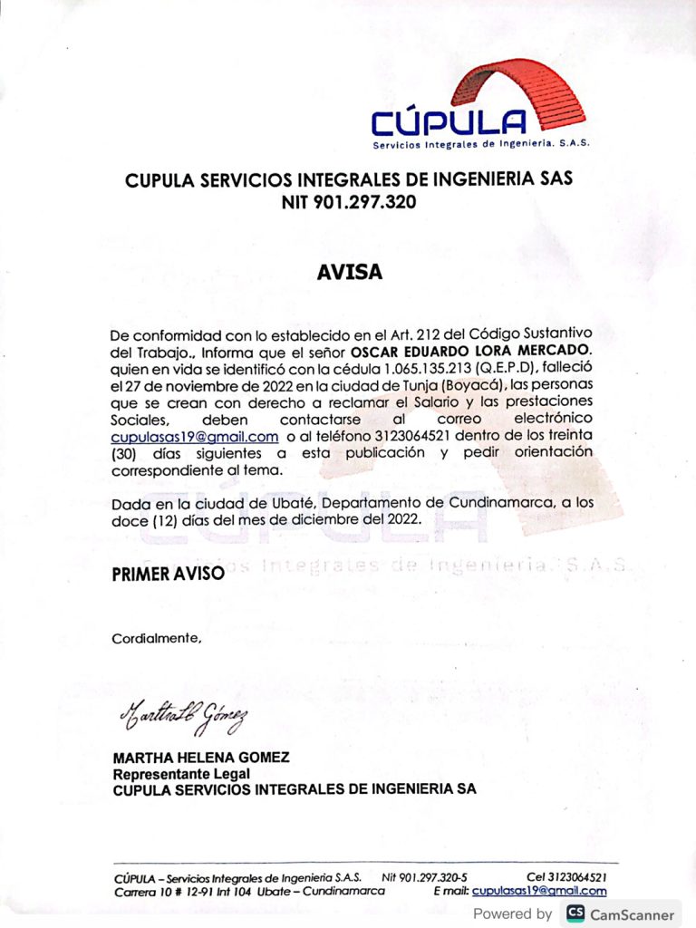 EdictosCúpula Servicios Integrales de Ingeniería SAS: Primer avisoPor ELDIARIO Boyacá - diciembre 12, 2022Publicidad Publicidad