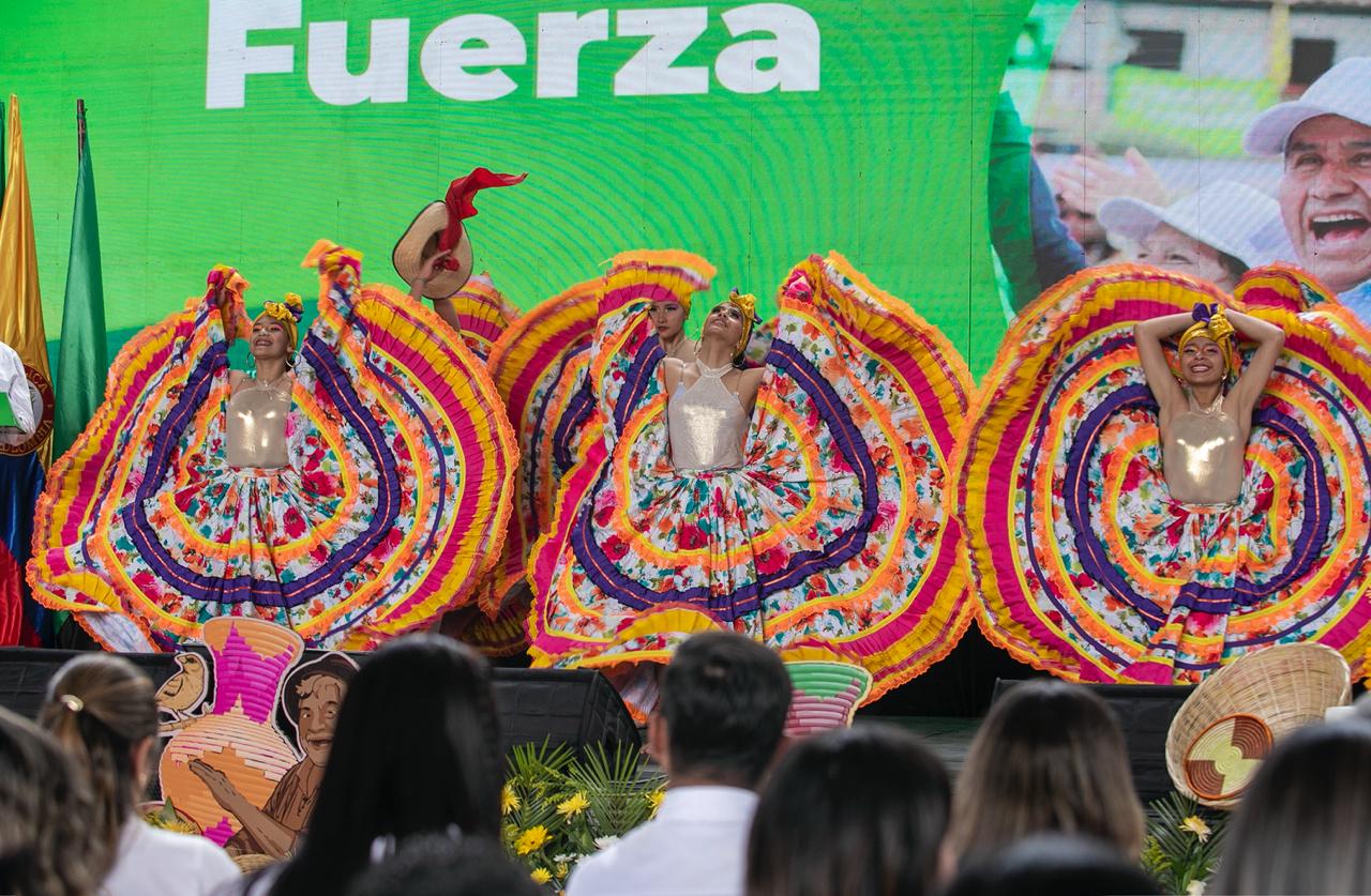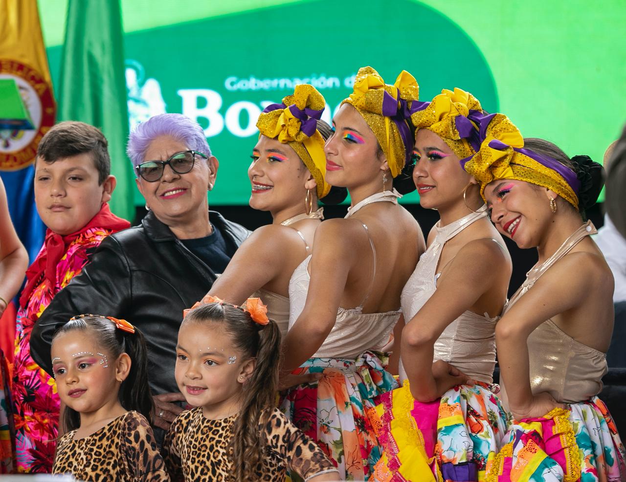 11. La secretaria de Cultura, Sandra Mireya Becerra, en medio de bailarines representantes de la magia boyacense.