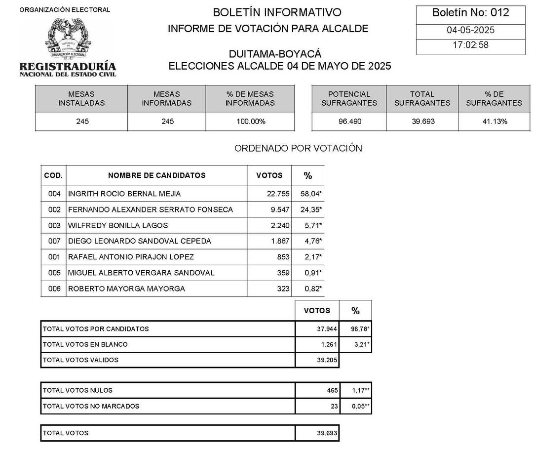 Este es el boletín final, con los resultados de las elecciones atípicas de Duitama realizadas este 4 de mayo.