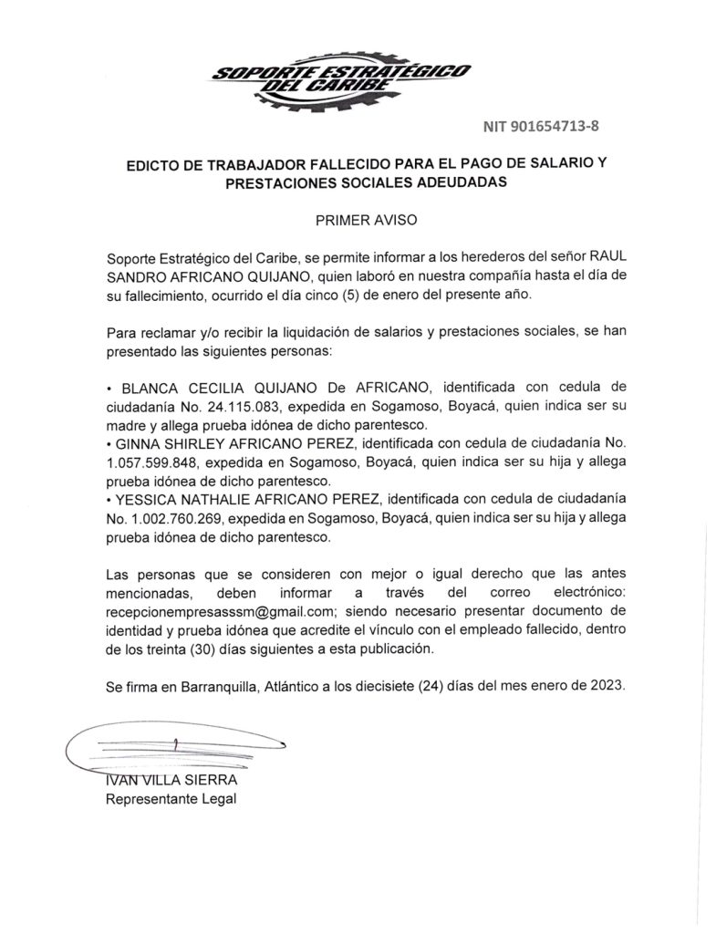 Soporte Estratégico del Caribe, se permite informar a los herederos del señor Raúl Sandro Africano Quijano.
