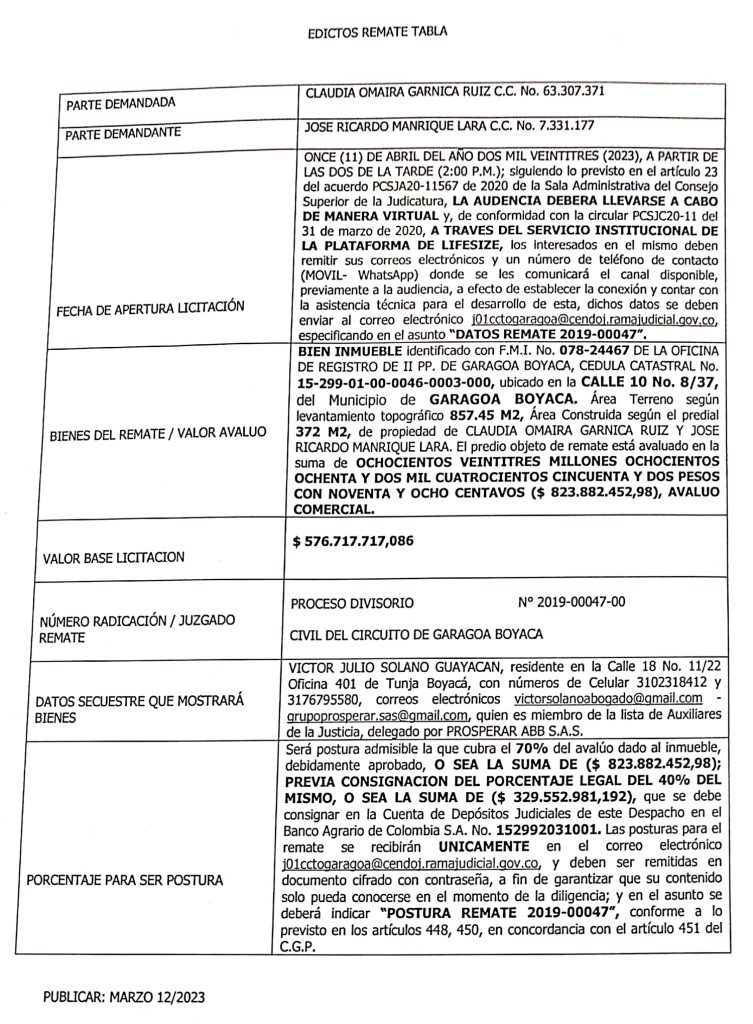 EdictosEdicto Remate Tabla, Bien inmueble, GaragoaPor ELDIARIO Boyacá - marzo 12, 2023Publicidad Publicidad