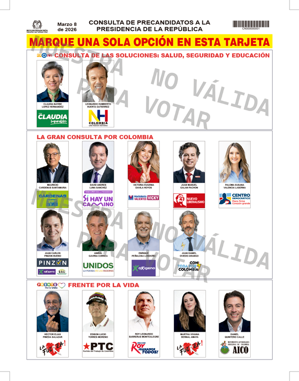 De acuerdo con la normatividad electoral vigente, cada ciudadano solo podrá participar en una de las tres consultas. El tarjetón electoral permitirá marcar una única opción; si el votante selecciona más de un precandidato o participa en más de una consulta, el voto será anulado.