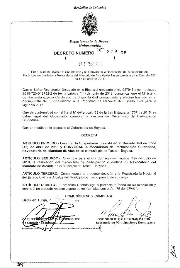 Mediante el Decreto 229, el Gobierno Departamental, dio vía libre para el proceso de revocatoria de mandato del alcalde del municipio de Tasco, Nelson Javier García. Este mecanismo de participación ciudadana ha operado porque la Registraduría Nacional del Estado Civil tal y como lo establece la norma, ha encontrado ajustado el cumplimiento de los apoyos mínimos para efectuarla.
