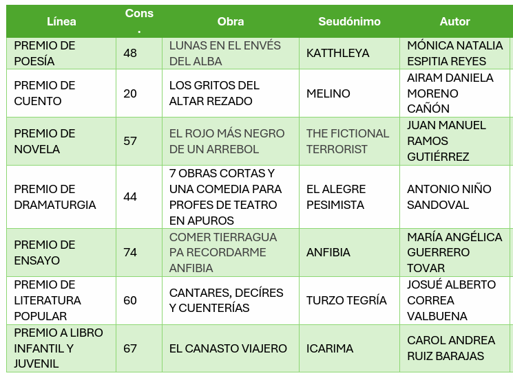 Los resultados finales fueron publicados mediante la Resolución No. 44 del 18 de noviembre de 2025, documento en el que se detalla tanto el puntaje obtenido por cada obra como el listado oficial de ganadores en las siete líneas de participación.