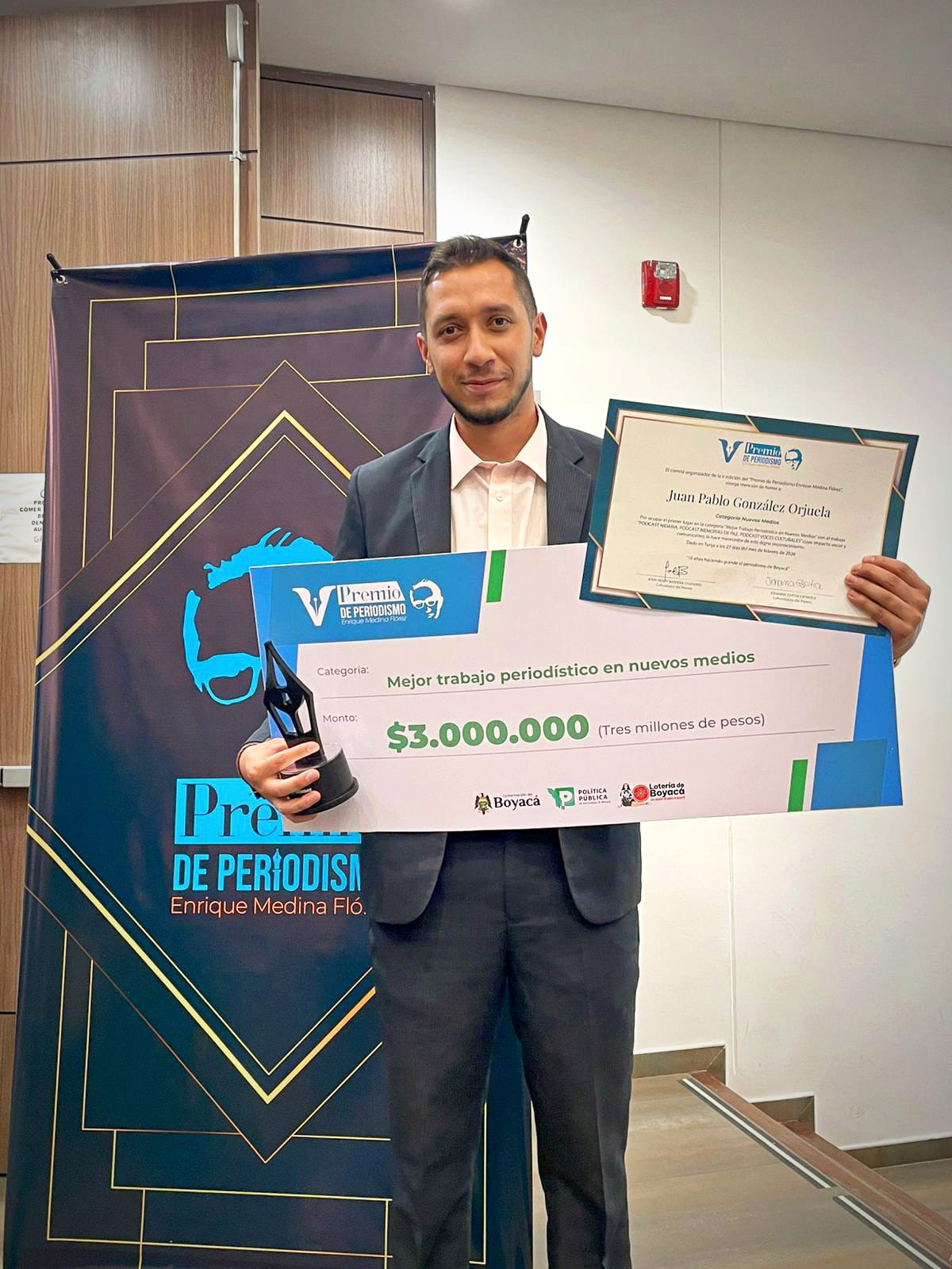 El Comunicador Social y Gestor Cultural Juan Pablo González, oriundo del municipio de Chiquinquirá, fue el ganador del quinto Premio Regional de Periodismo Enrique Medina Flórez en la categoría Nuevos Medios, considerada la más concursada de esta edición.
