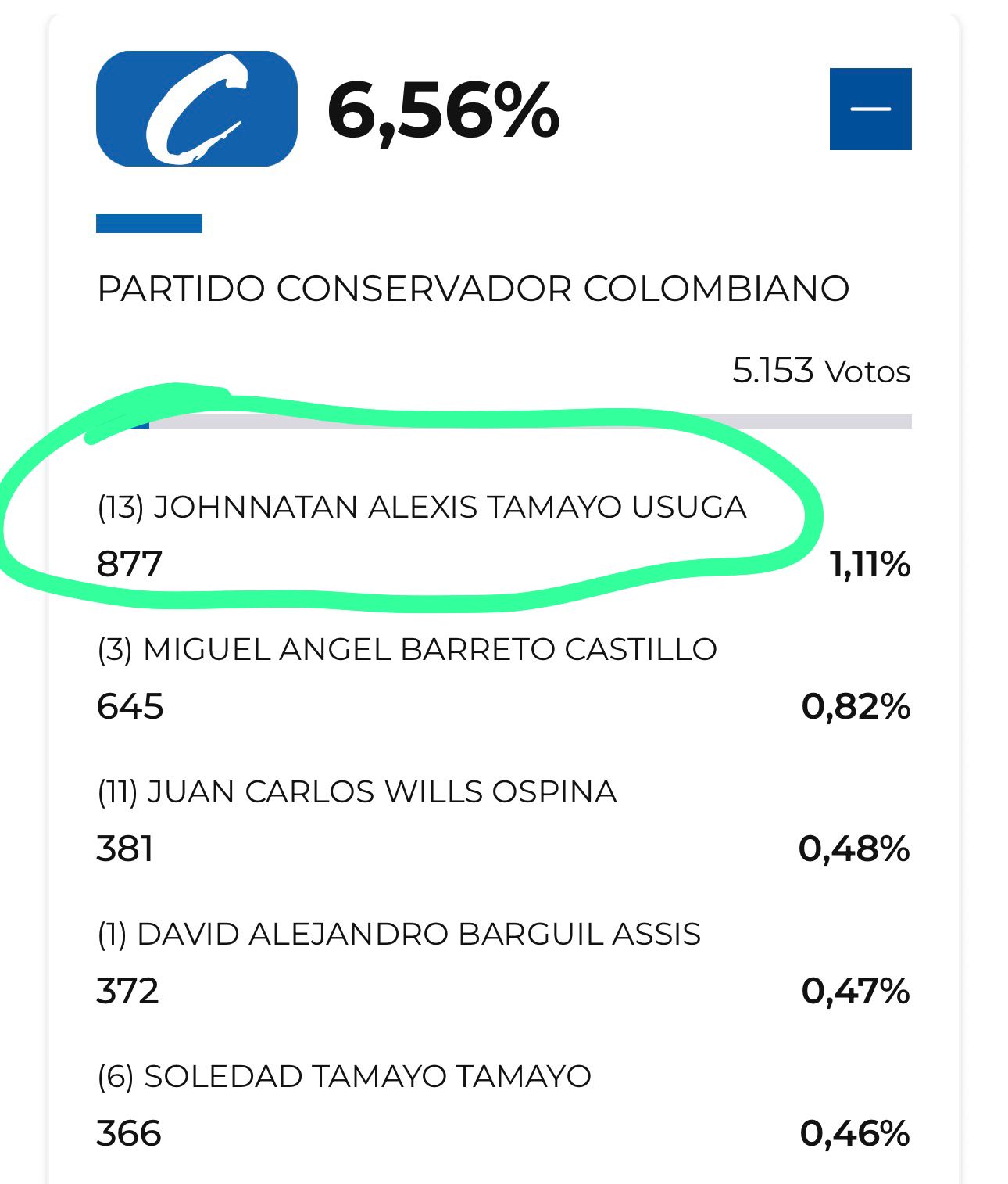 El siguiente nombre con buen recaudo de votos en Tunja fue el antioqueño Johnnatan Alexis Tamayo Usuga, quien en el país consiguió 77.533 votos y en Tunja 877. Tamayo tampoco vino a la capital boyacense en campaña y ningún concejal o dirigente local lo estaba apoyando, pero consiguió más votos aquí que quienes sí tenían estructura o estaban respaldados por concejales o líderes tunjanos.