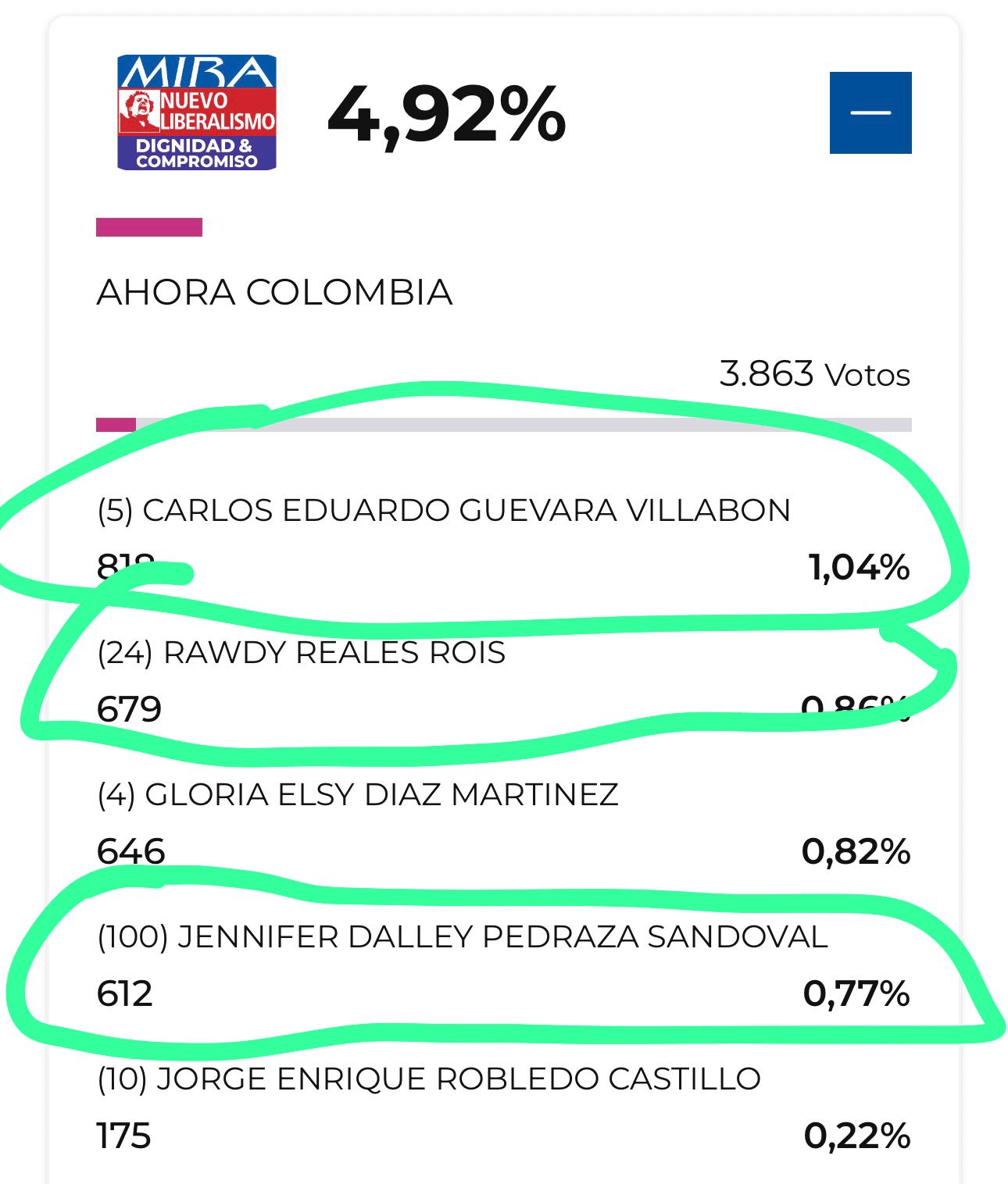 Del MIRA–Nuevo Liberalismo consiguieron excelentes votaciones en Tunja Carlos Eduardo Guevara Villabón, con 810 votos; Rawdy Reales Rois, con 679; Gloria Elsy Díaz Martínez (quien sí tenía estructura en Tunja); y Jennifer Dalley Pedraza Sandoval, con 612 votos.