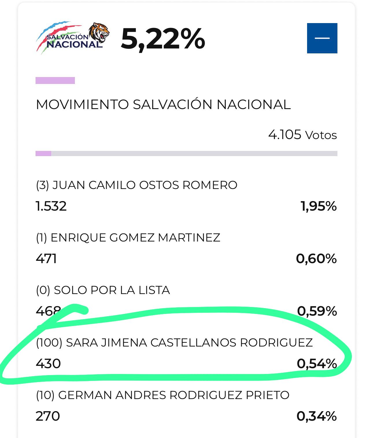 Del Movimiento de Salvación Nacional se destaca en Tunja la votación de Sara Jimena Castellanos, quien fue elegida senadora. Castellanos Rodríguez obtuvo en la ciudad 430 votos.