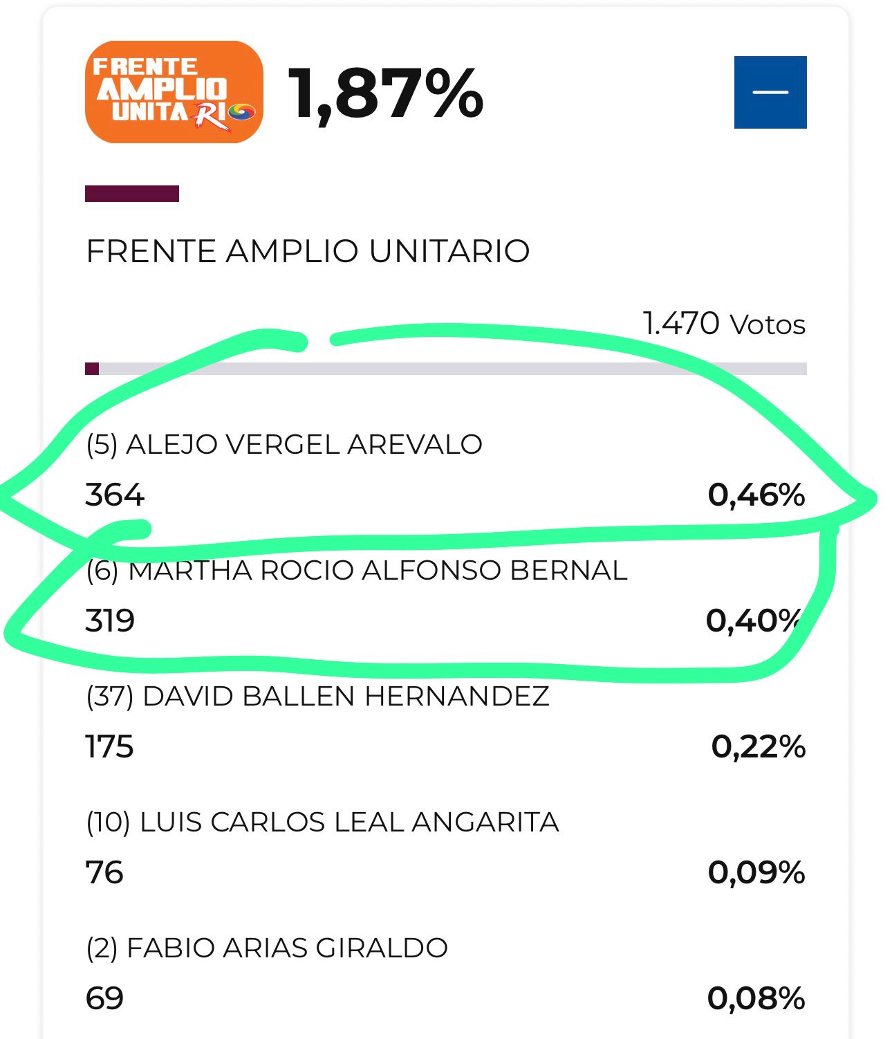 Y del Frente Amplio Unitario, Alejo Vergel Arévalo consiguió 364 votos y Martha Rocío Alfonso Bernal, 319.