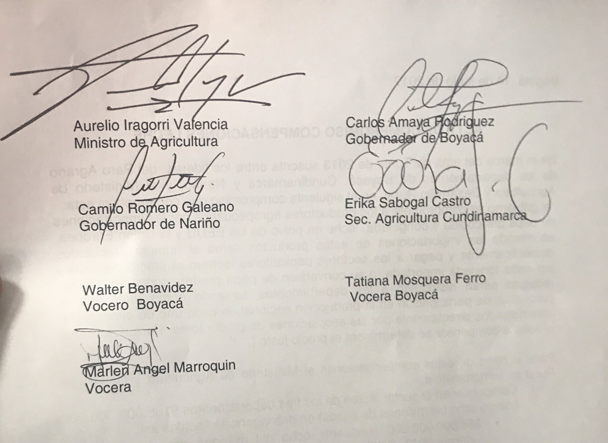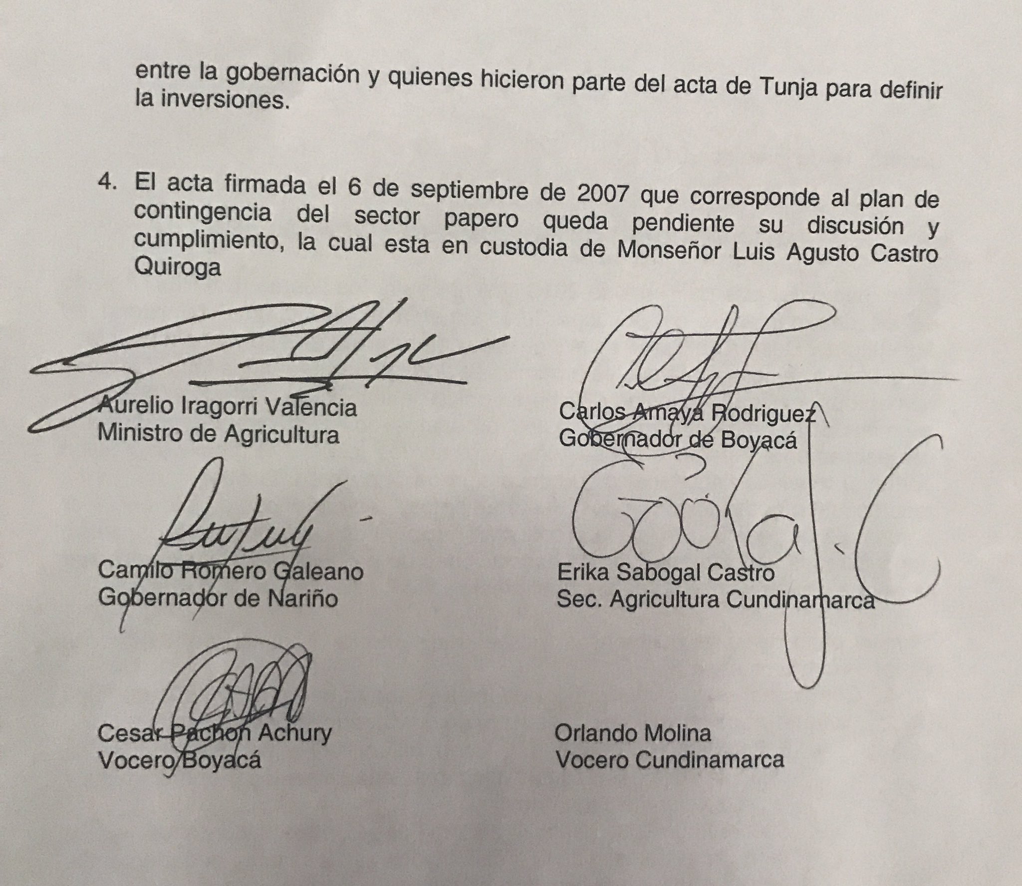 Para hoy, luego de una reunión sostenida en el ministerio de agricultura, el jefe de la cartera, Aurelio Iragorri, en presencia de los gobernadores de Boyacá y Nariño, Carlos Amaya y Camilo Romero; de la secretaria de Agricultura de Cundinamarca, Erika Sabogal Castro y de los voceros de la papa y de la leche de las regiones en mención, se comprometió a la reparación económica tal y cómo se expresa en el siguiente documento: