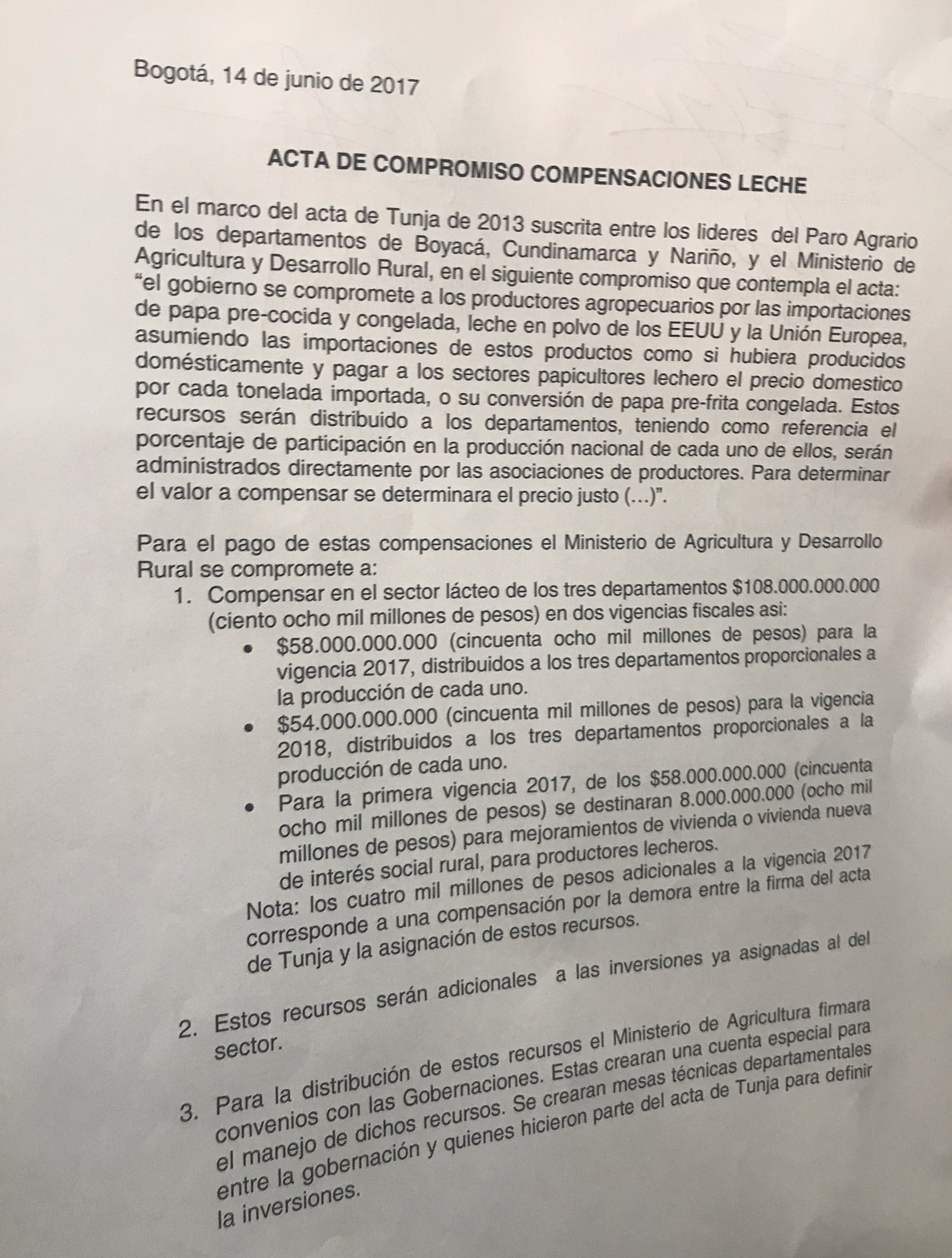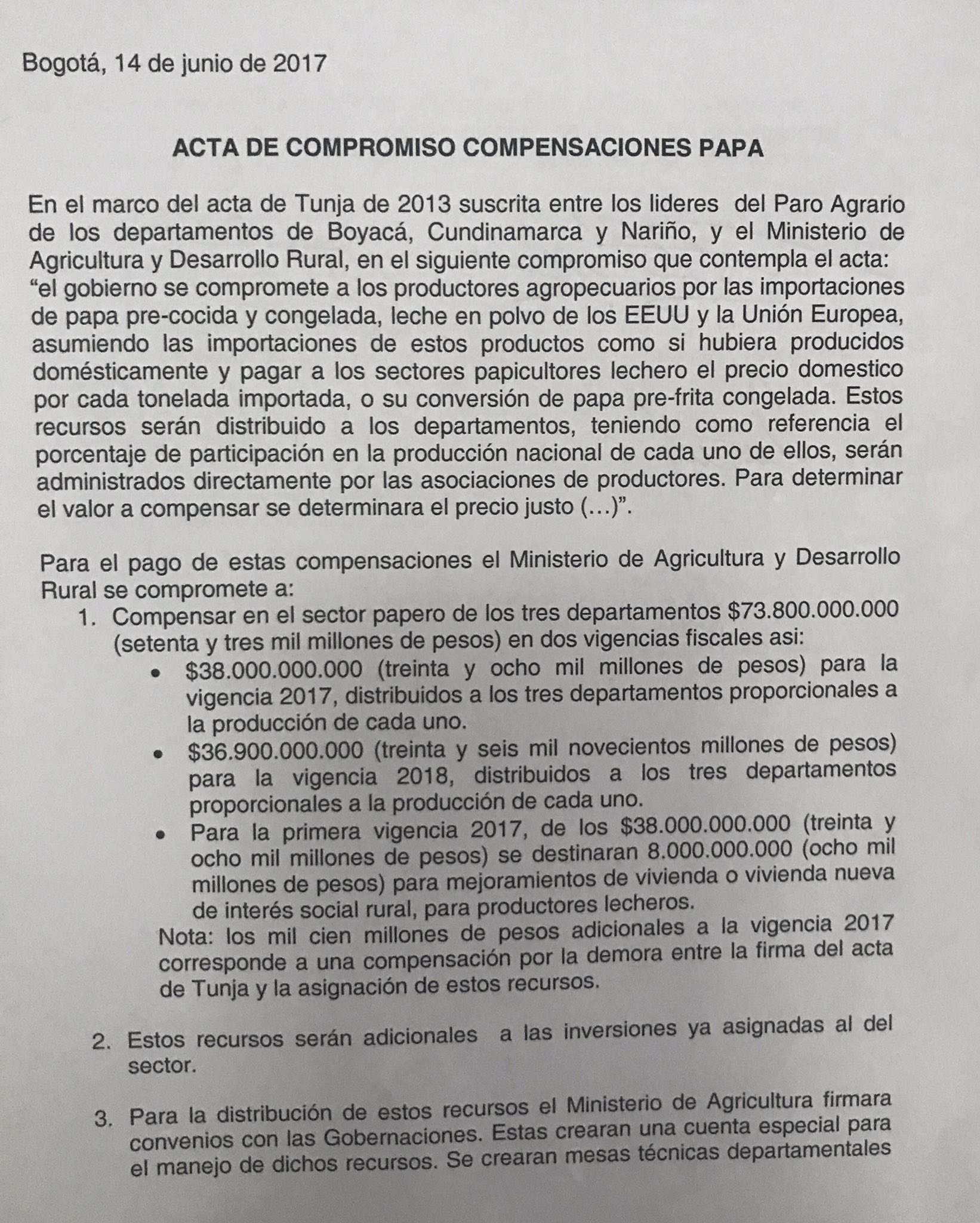 En el año 2013 en Tunja, se suscribió un acta entre los líderes del Paro Agrario de los departamentos de Boyacá, Cundinamarca y Nariño y el Ministerio de Agricultura y Desarrollo Rural, donde el Gobierno se comprometió a «compensar a los productores agropecuarios por la importaciones de papa pre-cocida congelada y leche en polvo, provenientes de Estados Unidos y la Unión Europea, asumiendo las importaciones como si hubieran sido producidos domésticamente y pagar a los sectores papero y lechero, el precio doméstico por cada tonelada importada, o su conversión de papa pre-frita congelada. Estos recursos serán distribuidos a los departamentos, teniendo como referencia el porcentaje de participación en la producción nacional de cada uno de ellos, serán administrados directamente por las asociaciones de productores. Para determinar el valor a compensar se determinará el precio justo (…)».