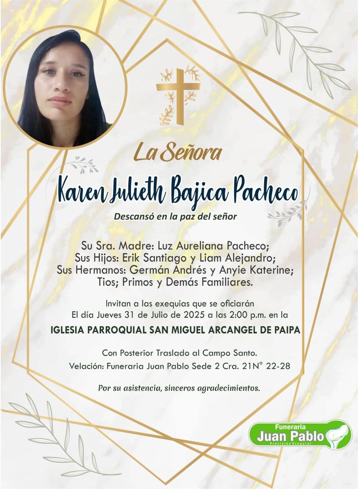 Las exequias de Karen Julieth Bajicá Pacheco se realizan hoy a partir de las 2 de la tarde en la catedral San Miguel Arcángel de Paipa. A Karen le sobreviven su madre, Luz Aureliana Pacheco, sus hijos Erik Santiago y Liam Alejandro y sus hermanos Germán Andrés y Anyie Katerine. El cuerpo está siendo velado en la funeraria San Pablo Sede 2.