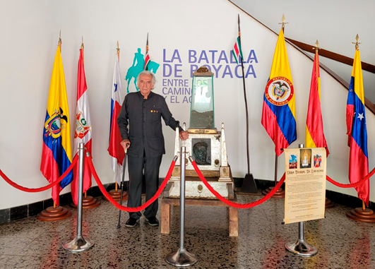 Maestro Eduardo Malagón Bravo, Custodio del sitio histórico de la batalla de Puente de Boyacá y presidente de la Confraternidad Bolivariana de América, autor de la Urna Tierras de Libertad monumento itinerante, donde reposan Tierras Sagradas de los Altares de la Libertad de América.