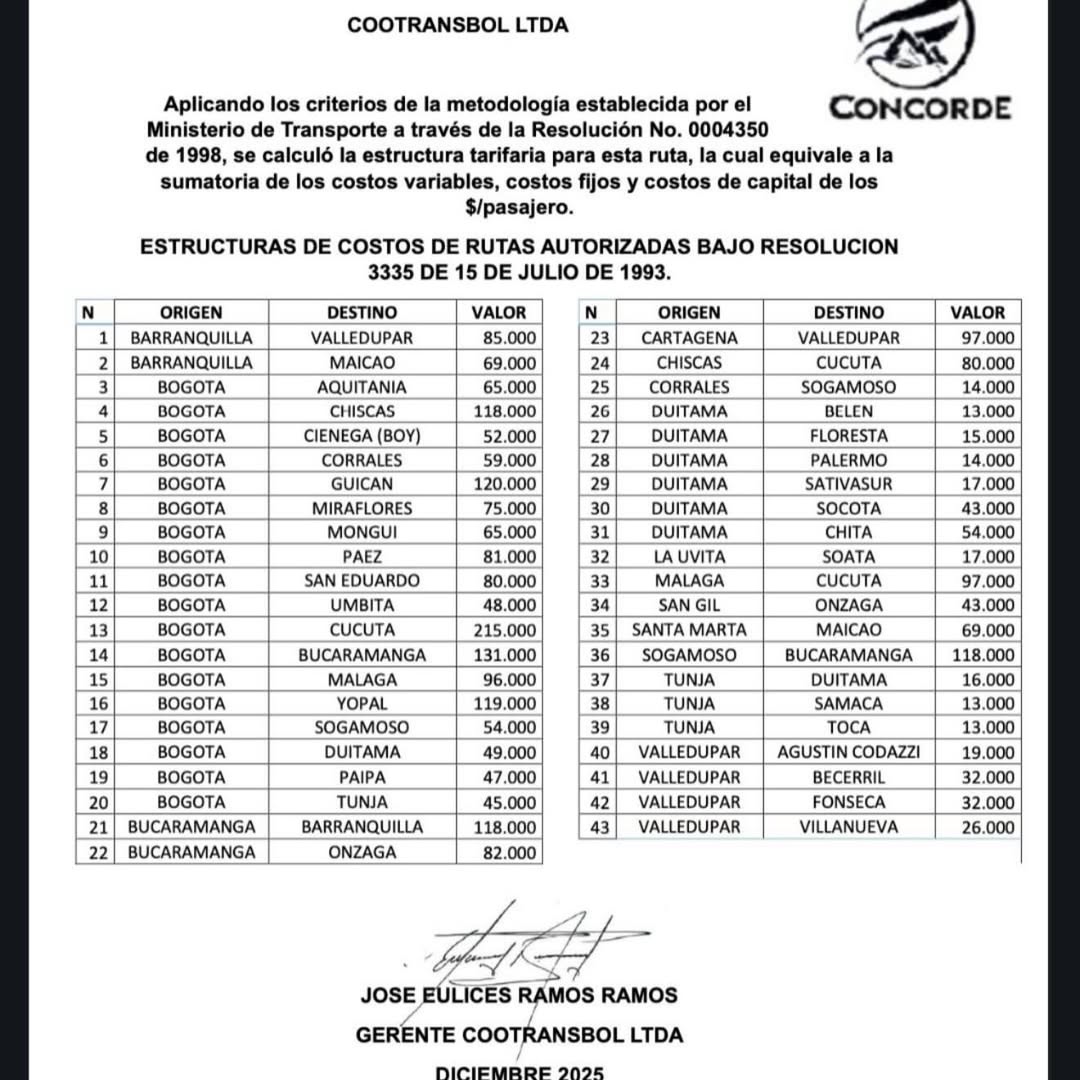 La empresa de transporte Concorde – Cootransbol Ltda. publicó su tabla de costos máximos para diversas rutas de transporte intermunicipal correspondiente a diciembre de 2025, lo que generó una ola de reacciones en redes sociales por el incremento en algunos trayectos tradicionalmente utilizados por los viajeros de Boyacá y otras regiones del país.