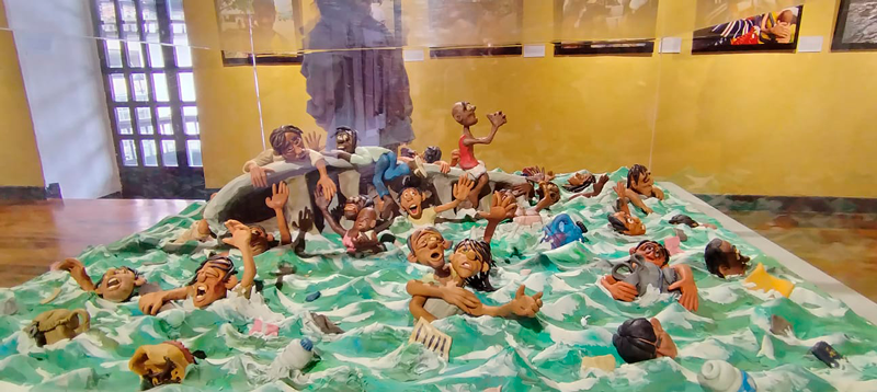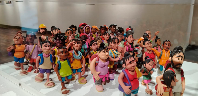 Entramos al antiguo ICBA a ver la exposición “Refugiados y migrantes en América”, de Édgar Álvarez. Figuras de plastilina modeladas como gente diminuta huyendo, cargando maletas, cruzando fronteras, mares, selvas, familias con mascotas, solitarios, madres, hijos y la muerte que nos pertenece a todos.