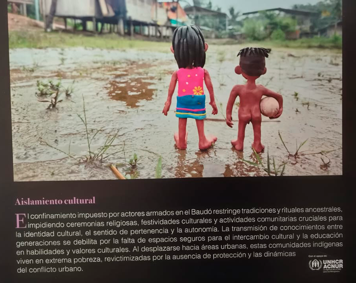 —¿Por qué el niño muestra el culo? —dice mi hija de cuatro años, y me señala una foto: figurillas que retratan a dos niños indígenas en medio de un lodazal, uno de ellos desnudo, pero con un balón en la mano: “El confinamiento impuesto por actores armados en el Baudó”, explica Édgar.