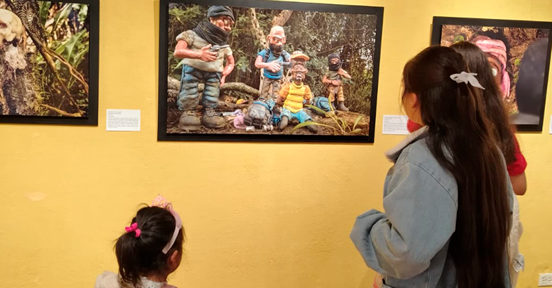 —¿Por qué el niño muestra el culo? —dice mi hija de cuatro años, y me señala una foto: figurillas que retratan a dos niños indígenas en medio de un lodazal, uno de ellos desnudo, pero con un balón en la mano: “El confinamiento impuesto por actores armados en el Baudó”, explica Édgar.