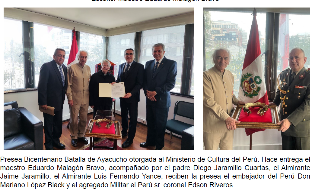 El Centro de Estudios Histórico Militar del Perú ha otorgado la Medalla Institucional al maestro Eduardo Malagón Bravo Custodio del Sitio Histórico de la Batalla de Puente de Boyacá por las acciones desarrolladas dentro de la programación del Bicentenario de la Batalla de Ayacucho, en Colombia y en la hermana República del Perú.