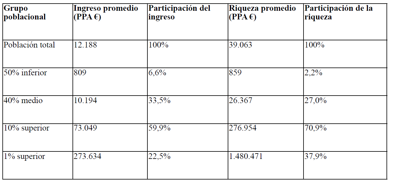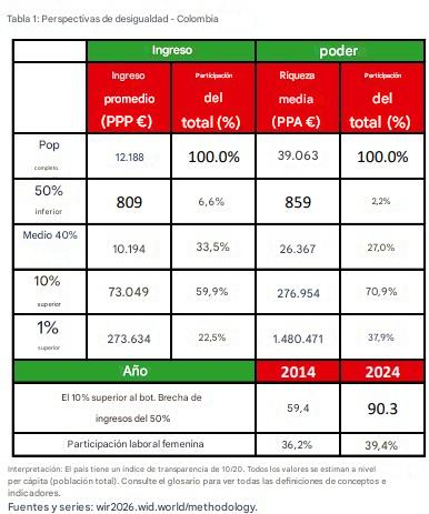 Colombia se encuentra entre los países más desiguales del mundo. El 10% más rico concentra cerca del 60% del ingreso nacional y más del 70% de la riqueza, mientras que el 50% de la población apenas accede a una fracción mínima del ingreso y prácticamente no posee patrimonio.