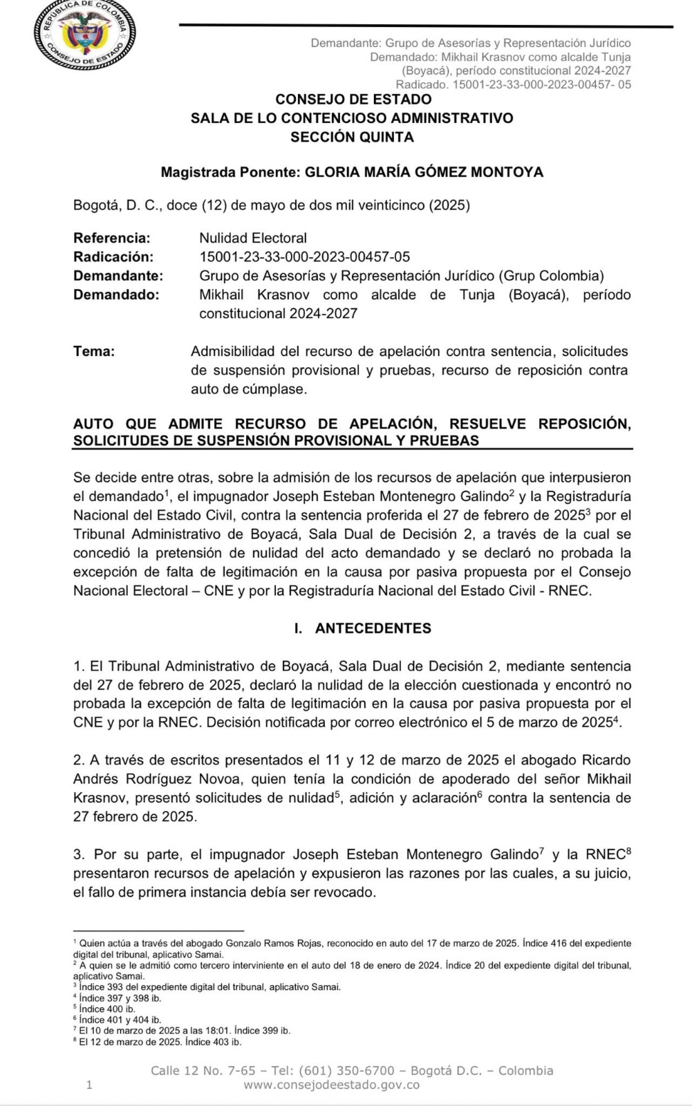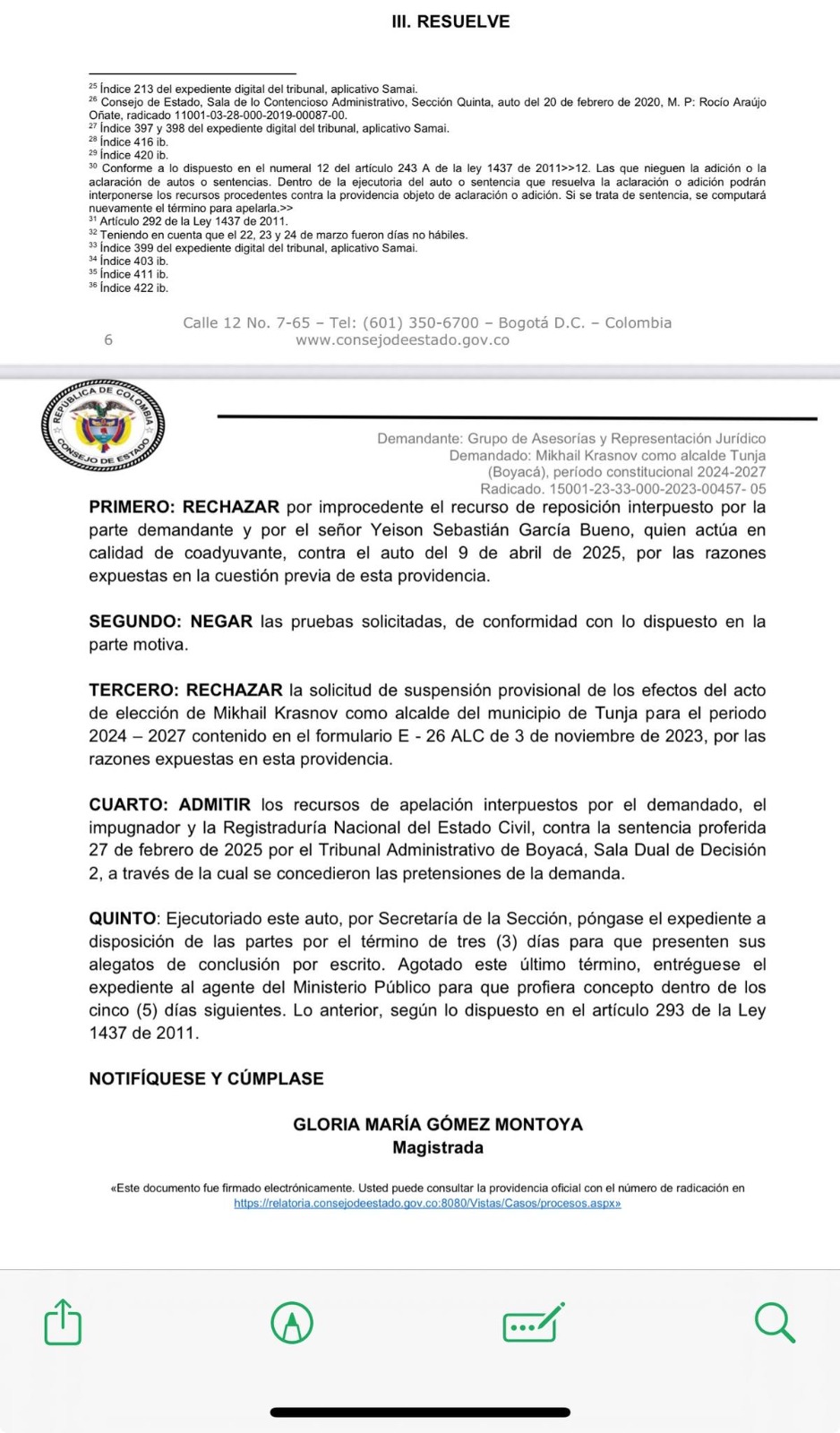 Mientras se resuelve la apelación, Krasnov continúa en el cargo, ya que el fallo de primera instancia no ordenó su suspensión inmediata. Se espera que el Consejo de Estado emita su decisión en los próximos días, lo que definirá el futuro político del mandatario tunjano.