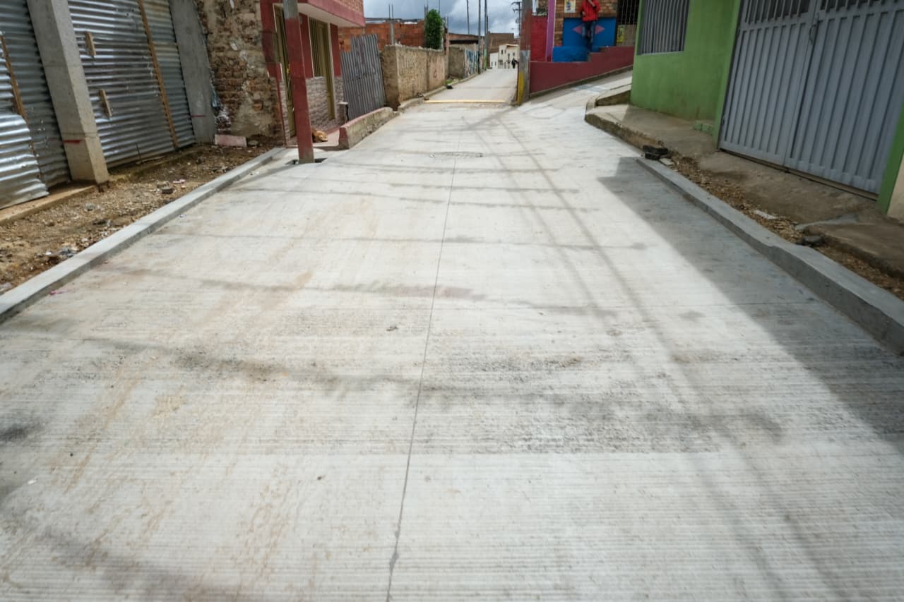 La intervención comprendió la recuperación de 350 metros cuadrados de pavimento rígido, equivalentes a 65 metros lineales, con un ancho de 5.2 metros y un espesor de 18 centímetros, cumpliendo los estándares técnicos que garantizan mayor durabilidad.