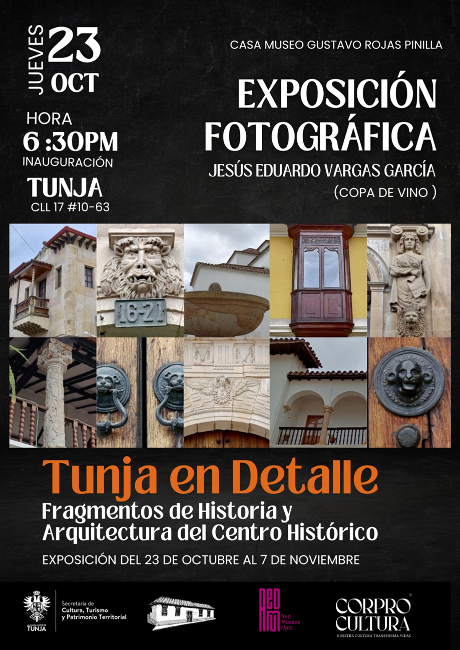 La Casa Museo Gustavo Rojas Pinilla abre sus puertas este jueves 23 de octubre a las 6:30 p.m. para la inauguración de la exposición fotográfica «Tunja en Detalle», una mirada única del fotógrafo del patrimonio Jesús Eduardo Vargas García, quien nos invita a descubrir la riqueza visual y simbólica de los detalles arquitectónicos del centro histórico de la ciudad.